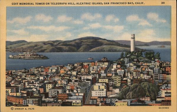 COIT MEMORIAL TOWER ON TELEGRAPH HILL, ALCATRAZ ISLAND, SAN FRANCISCO BAY, CALIF.