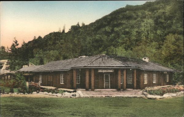 Front: BIG SUR LODGE COFFEE SK CABINS Back: HAND COLORED Big Sur LODGE BIG SUR,CALIFORNIA ON CARMEL-SAN SIMEON HIGHWAY Big Sur Lodge Pfeiffer Redwoods State Park THE FINEST AMERICAN MADE VIEW POST CARDS-THE ALBERTYPE CO., BROOKLYN, N.Y.
