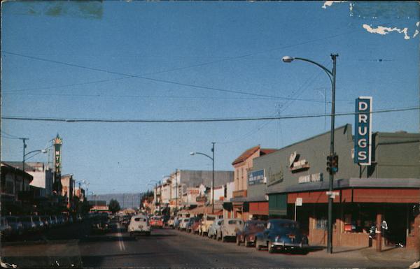 A portion of the business district, in this fast growing home and industrial community. The city, incorporated in 1902, has enjoyed a steady growth and is planned for commerce, industry and residence. It is the home of Moffett Field U.S. Naval Air Station. From the Darlene Thorne Collection |