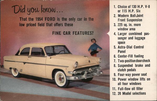 Did you know that the 1954 Ford is the only car in the low priced field that offers these Fine Car Features? Choice of 130 HP V-8 or 115 HP Six, Modern ball-joint front suspension, 225 sq. in. more window area, larger combined passenger and luggage space, Astra-Dial Control Panel, center-fill fueling, two-position doorcheck, suspended brake and clutch pedals, four-way power seat, power window lifts on all four windows, full-flow oil filter, 28 model selections. From the Darlene Thorne Collection |