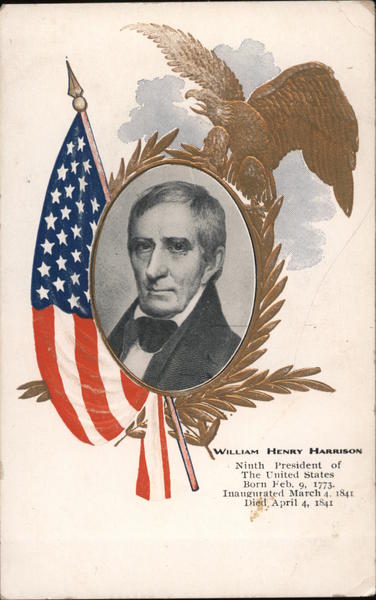 Front: WILLIAM HENRY HARRISON Ninth President of The United States Born Feb. 9, 1773- Inaugurated March 4, 1841 Died, April 4, 1841 Back: POST CAR AND CANADA, FOREIGN, Two CENTS,