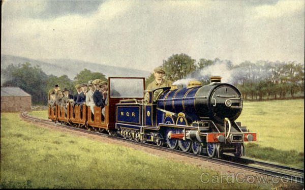 | Eskadale Narrow Gauge Railway.One of the Summer Service Trains hauled by Atlantic Type Locomotive "Sanspareil".The open coaches shows in the photograph are extremely popular and enable passengers to enjoy the mountain air and obtain an uninterrupted view of the magnificent scenery along the line. |