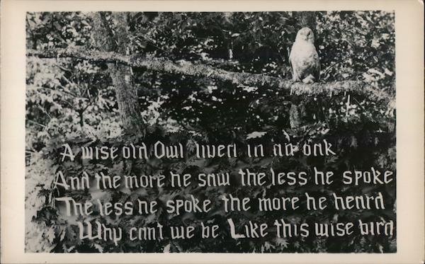 Front: A mise old Owl Hveri in ad önk And the more he snw the less he spoke The less ne spoke the more he henrd Unv cant we be Like this wise bird Back: DEVOLITE PEERLESS
