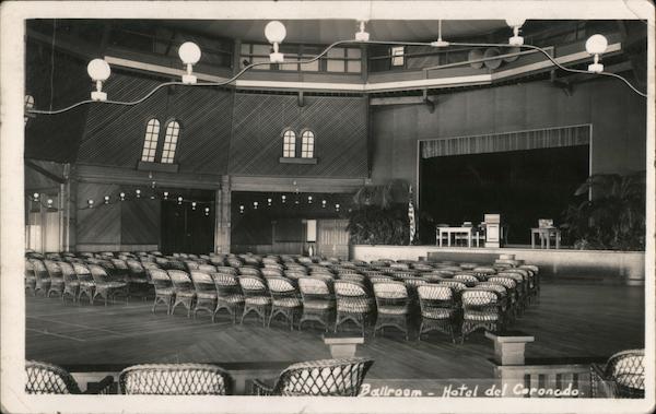 Front: Ballroom - Hotel del Coronado. Back: POŠT CARD I HERE Harumfred E. Webber 2116 e sh Ian L ege 200