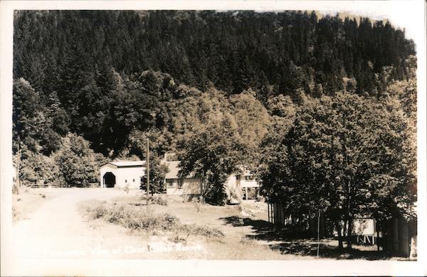 View of covered bridge, tree covered mountain, Clear Creek Resort