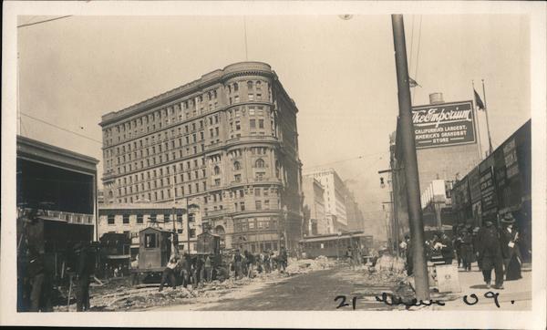 Ruins after earthquake, men cleaning street, streetcar, The Emporium.