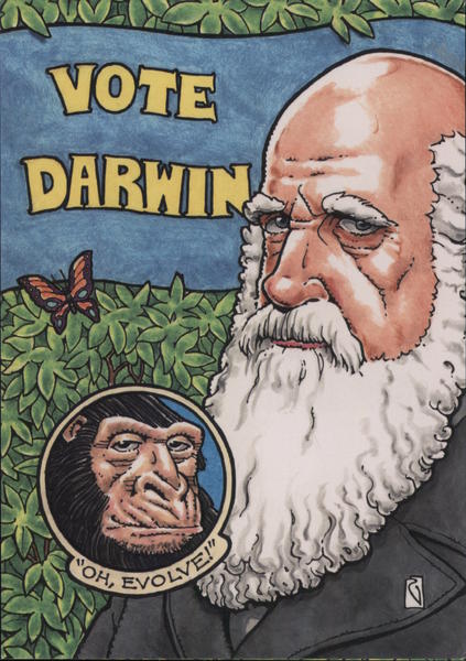 Front: VOTE DARWIN 11 "OH, EVOLVE!" Back: B.J. AND JONELL DAVIES 6505 E CENTRAL #187, WICHITA KS 67206 IPOSTCARD