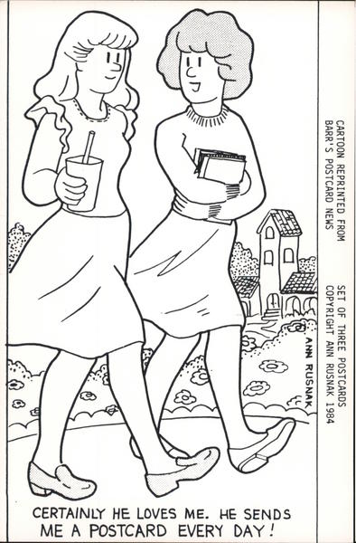 Front: CERTAINLY HE LOVES ME. HE SENDS ME A POSTCARD EVERY DAY! CARTOON REPRINTED FROM BARR'S POSTCARD NEWS SET OF THREE POSTCARDS COPYRIGHT ANN RUSNAK 1984 ANN RUSNAK Back: RUSNAK BOX 1417 GARDNERVILLE NV 89410 11