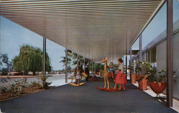 Rocking Horses and a Giraffe provide fun for young and old at the covered entrance to the Nut Tree Restaurant, serving Western Food for over a third of a century. U.S. 40, Vacaville, California.