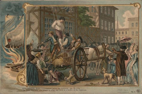 The stamp-distributor was hanged in effigy and burnt in a bonfire of the fragments.