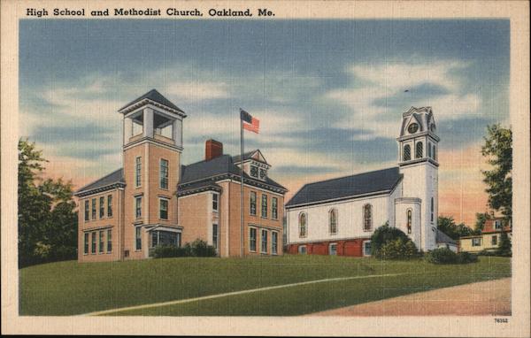 Front: High School and Methodist Church. Oakland, Me. 76352 FEFE Back: MADE IN U. S. A LU *TICHNOR QUALITY VIEWS" REG. U.S. PAT. OFF. MADE ONLY BY TICHNOR BROS., INC., BOSTON, MASS.
