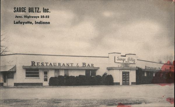 Front: SARGE BILTZ, Inc. Junc. Highways 25-52 Lafayette, Indiana |Sange, Giliz INC. RESTAURANT & BAR RESTAURAVT&BA AMUT Fist Calas STEAK Back: Enjoying Good Food at Sarge Biltz Restaurant. Wish you were here. FREE Give card to your waitress. To: