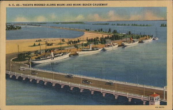 Front: D. C. 43-YACHTS MOORED ALONG MIAMI AND MIAMI BEACH CAUSEWAY 4A-H670 Back: DADE COUNTY NEWSDEALERS SUPPLY CO., MIAMI, FLA.