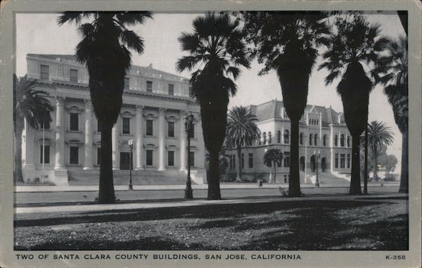 Front: litf 14 TWO OF SANTA CLARA COUNTY BUILDINGS, SAN JOSE, CALIFORNIA K-358 Back: VIEW CLEAR MED. BY WAYNE PAPER BOX & PRTG. CORP., FORT WAYNE, IND.
