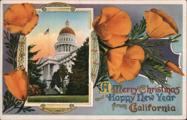 Front: KHMerryChristimas Happy New Year from California STATE CARITOL Back: Post Guro STATLS MEY.ICO FOREIGN 2ยข I am sending you a remembran a little dorly, we are all well and hope you fare te e same; PUBLISHED BY EDW. H. MITCHELL, SAN FRANCISCO