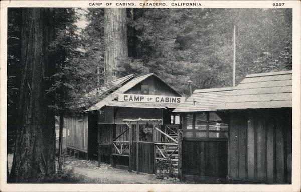 Front: CAMP OF CABINS, CAZADERO, CALIFORNIA 6257 CAMP OF CABINS Back: ce PACIFIC NOVELTY CO. SAN FRANCISCO GLOS ANGELES