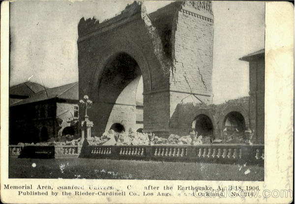 Memorial Arch, Stanford University Ca. after the Earthquake, April 18, 1906. Published by the Rieder-Cardinell Co., Los Angeles and Oakland.