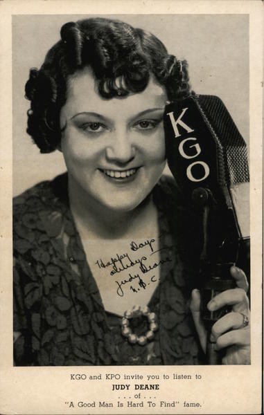 Front: lays heam Jud 1.18 KGO and KPO invite you to listen to JUDY DEANE .. of . "A Good Man Is Hard To Find" fame. KOO Back: .K.Q Win P9 / 20 FRIDAY Luxograph Print-Art Card Co., Alameda, California 330 PM/THORS