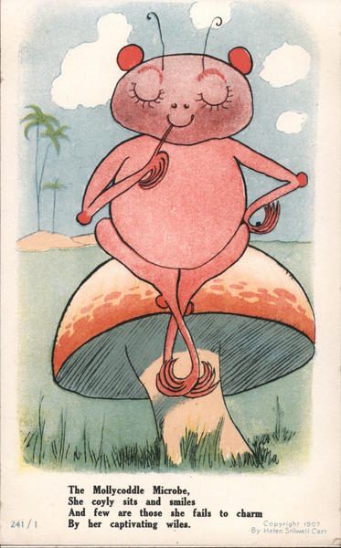 Front: The Mollycoddle Microbe, She coyly sits and smiles And few are those she fails to charm By her captivating wiles. 241/1 Copyright 1907 By Helen Srilwell Carr Back: THIS SPACE MAY BE USED FOR WRITING