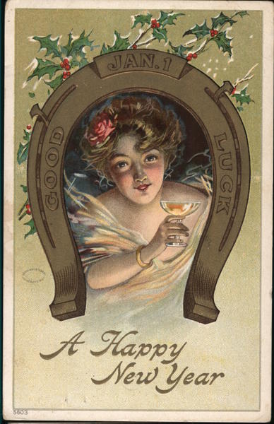 Front: JAN.1 A Happy New Year 5603 LUCK Back: PHP FORCARD JAN $ ~16 te Er. ILL. nating dong on mahnutst as gat. ne har holds are ym. you coming NEW YEAR SERIES NUMBER 50 Cly
