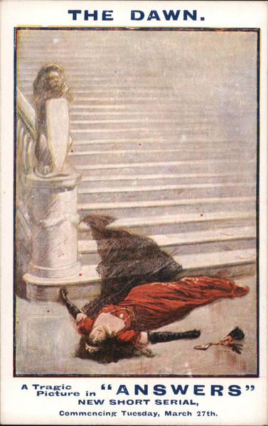 Front: DAWN. A Tragic Picture in "ANSWERS" NEW SH ORT SERIAL, Commcncing Tucsday, March 27th. Back: David Allen and Son3, Ltd., 180, Fleet St., London, E.C. and Wealdstone, Mdx. 2000 STAMP. HALFPENNY AFFIX
