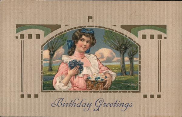 Birthday Greetings - Girl in Pink Dress With Basket of Flowers