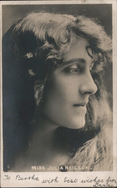 Front: MISS JULIA NEILSON Yo Bertha LANGFIER with best wiohes from Lan'a Back: E1-00 Pexes ** RAPHAEL TUCK & SONS' REAL PHOTOGRAPH: POSTCARD SERIES 5004. STAGE FAVOURITES." Miss B Higham High Bank newhey