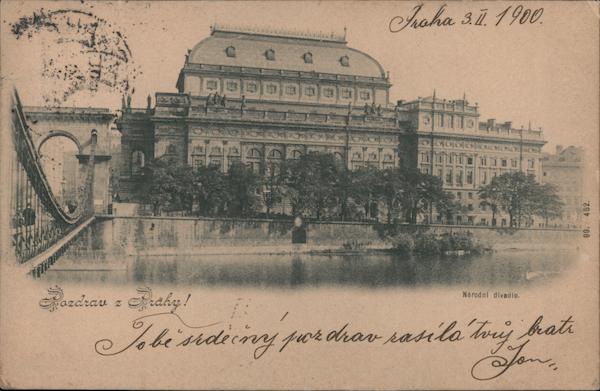 Front: Araha 31.1900. Razdrav z frahy ! Národní divadlo. C. Iobi'srdicny vy hati pordrav raila '66 452. Back: KELLER ūll ZSO AN DOPISNICE. SHA lo 3.POST. 10 ci osen ove deera mlynoid Oslavanech Ivancia cic na na Morave