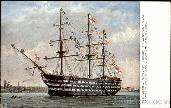 H. M. S. Victory, Portsmouth harbour. Flying Nelson's famous signal: - England expects every man to do his duty.