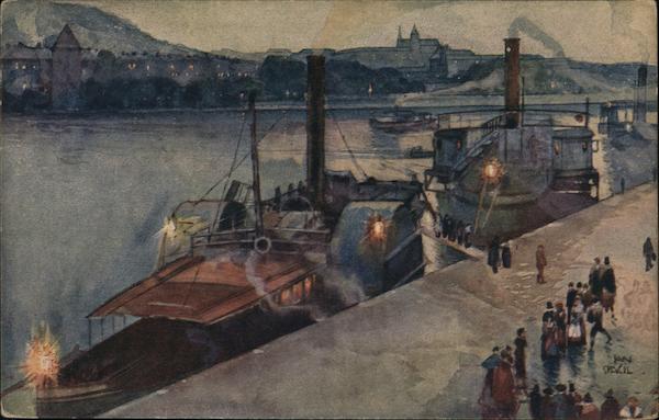 PRAHA - PRAGUE. Přístaviště parníků. Bateaux à Vapeur sur la Vltava. Steam-Schips on the Vltava. Č. 23. Umělecké dopisnice dle orig. J. Spáčila. Édit. F. J. Jedļička, Prague-I., 339. 3.py