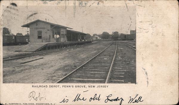 Front: RAILROAD DEPOT, PENN'S GROVE, NEW JERSEY Rob. is the oled Lovedy Wall E. W. HUMPHREYS, PUBLISHER, WOODSTOWN N. J Back: EEDE IT POST - CARD APR MARANIN 1790 1706 FRANK PE This Florrie Berry ta 314 Cumberland su- 3 Bouces lei Edy Camden la