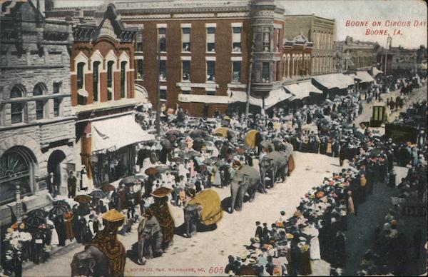 Front: TABC BOONE ON CIRCUS DAY BOONE, IA. HUB Dr DFA C, KRCPP CO. PUB, MILWAUKEE, NO, 505 Back: IS. POS- | Ic CAN A DIAN MEXICAN FOREIGN 20 Zona Post Gara