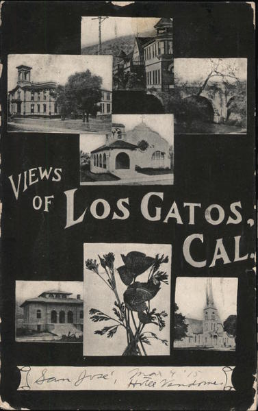 Front: VIEWS OF Los GATOS, CAL, Sanfre', mary'ls tee Vondone Back: 12 condus MA PACIFONE MAR 5 3 WORLD'S PANAMA PAD EXPOSITIO SAN FRANA WERANCIS 1915 Dus Miss Gertrude 450 Ahrens, nare mer asadena Calif.