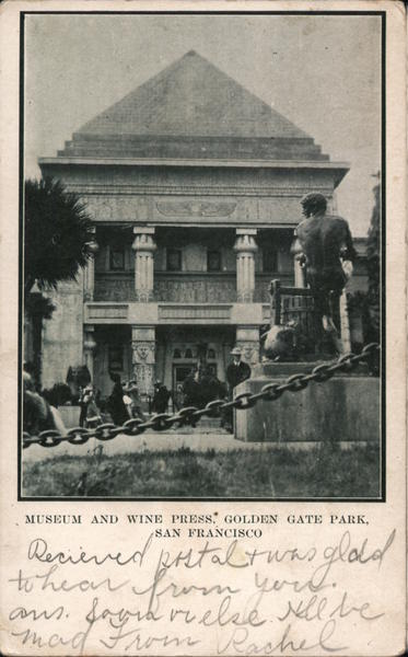 Front: MUSEUM AND WINE PRESS, GOLDEN GATE PARK, tohear from Rerieved prtaltwas glold KAstaltuas kerl. ans. fagrd re else Nllde elae Nellbe フhcdさnon eshel 146 Back: Miss May Hora Canha a orense Alame da leo 125 orna