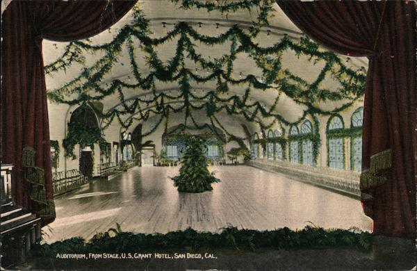 Front: AUDITORIUM, FROM STAGE, U.S. GRANT HOTEL. SAN DIEGO, CAL. Back: pengg-6 BROTA TICHNO COAST GERS IN CARD = то CAL OOSTON, Coast SELES CAL ASS LO LOS ANGE TA EXPOS SITIO PANA d SAN