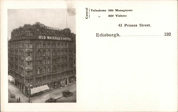 Front: Telephone 1006 Manag'eress 3659 Visitors 43 Princes Street, CRANSTON'S 192 Edinburgh, OLD WAVERLEY HOTEL Central Back: This Space may be used for Communication