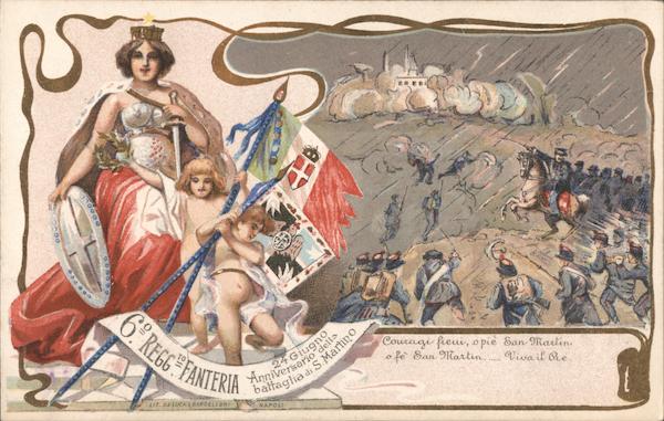 Front: 6. REGG FANTERIA Anniver Giugdella baltaglia di S.Martino Couragi fieui, o pie San Martin. o fe San Martin. Viva il Re LIT. DELUCA & BARDELLONI NAPOLI Back: CARTOLINA POSTALE ITALIANA (CARTE POSTALE D'ITALIE) 20-