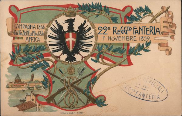 Front: 22 REGG ANTERIA CAMPAGNA 1866 MOWAZIONEMPISA 1870 AFRICA |° NOVEMBRE 1859 WEEKT DFFICIALI G0 FANTERIA REOSU STAB A.MARZI ROMA TERT Back: CARTOLINA POSTALE ITALIANA (CARTE POSTALE D'ITALIE)