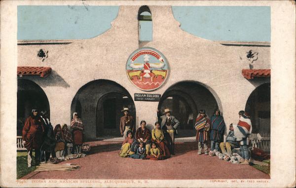 Front: INDIAN BUILDING FED HARVEY 7946, INDIAN AND MEXICAN BUILDING, ALBUQUERQUE, N. M. COPYRIGHT, 1905, BY FRED HARVEY. Back: AND CANADA, FOREIGN, Two CENTS. TUIS SIDE FOR THE ADDRESS.