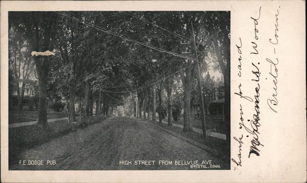 Front: for card Misionals. Wood Bristol -Conn. Thank you F.E.DODGE PUB. HIGH STREET FROM BELLVUE AVE. BRISTOL, CONN. Back: UNTEI VIVE Post Caromatika ONN PANKLIN 1790 1705 FRANK DEC Gates Oce CAPOEG 3). Qatee 59 Borrere St. Newtonville 7лога.