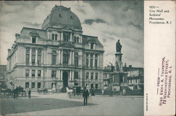 Front: Miss EMMA A. THURSTON, 79 WASHINGTON STREET, PROVIDENCE, R. I. 5031- Providence, R. I Monument. Soldiers City Hall and Back: Lr Post Pard-29- SNIM 1206 FRANK NKLIN 1790 DECR T DDRESS 61HwW go Gatis 39 legges St. s onille Mac