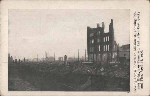 Front: Looking across Fourth to Mission st., showing Pio- neer Bldg., San Francisco, Cal., after Earthquake and Fire, April 18, 1906. Back: DOST (ARD 20 B SOUVENIR POSTCARDS) winter MT M. RIEDER, PUB., LOS ANGELES, CAL.