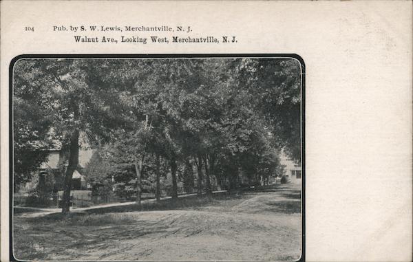 Front: 104 Pub. by S. W. Lewis, Merchantville, N. J. Walnut Ave., Looking West, Merchantville, N.J. Back: STEVXXV X PROCLAIM LIBER IN PHILAD: BYORDER OF THE EPASS Store ET NILAD ENDCCLIU