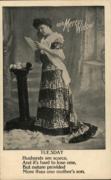 Front: OUR TUESDAY Husbands are scarce, And it's hard to lose one, But nature provided More than one mother's son, Back: ANGLO LINE SBRILS