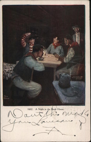 Front: COPYRIGNT 1997 BYH.H.TAMMEN DENVER FAUL GREGO 14 1602. A Night in the Bunk House. me Lane, Back: NEURS R902 UNITED STATESOF EYE TE 1296 FRANKLIN 1790 This Space Can Be Used for a Written Message. & w. Glapke CE wi 71 Se Howard Sr. arrow Ohd.