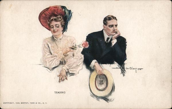 Front: ien Chissy TEASING COPYPIGHT, 1908, MOFFAT, YARD & co., N. Y. Back: 062INITANYHA 9021 HAVEN WNO 1999 is on y79 AOSAVLS (SOLINO SOLE DISTRIBUTER, EDWARD GROSS, N. Y MANS miss Caroline Clark 95 Elm&t. veriden, con