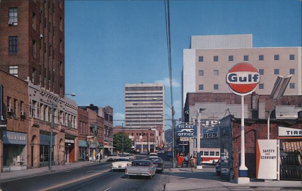 Front: Gulf BANK TICKET OFFICE TIRE 1TED FORD BUS A SAFETY ECONOMY Back: KA-38 Looking East on Patton Avenue showing new bank buildings. Asheville, N.C. C19324–Color photo by Bill Kobert COLOR BY MIKE ROBERTS