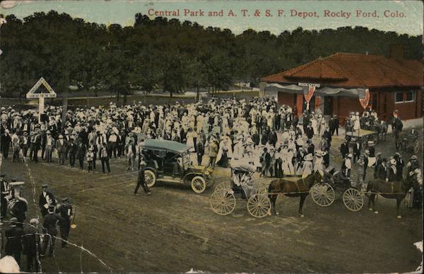 Central Park and A. T. & S. F. Depot, Rocky Ford, Colo.