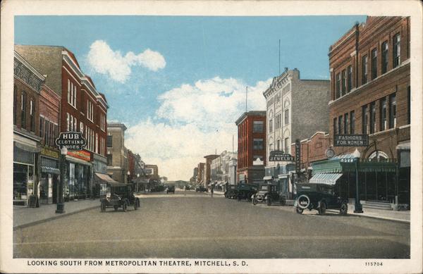Front: FASHIONS FOR WOMEN HUB CLOTHING HOES CLOTHERS JEWELRY 115704 LOOKING SOUTH FROM METROPOLITAN THEATRE, MITCHELL, S. D. Back: L. E. STAIR, MITCHELL, S. D. C. T. AMERICAN ART COLORED T.