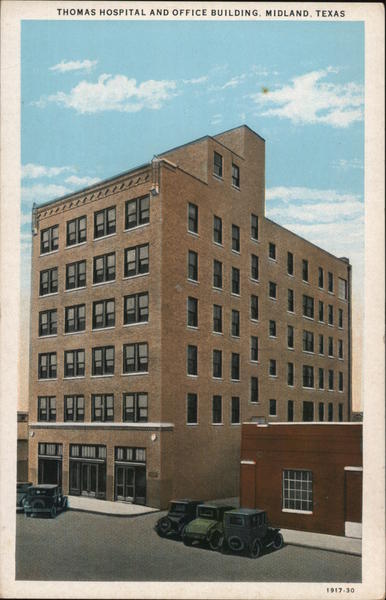 Front: THOMAS HOSPITAL AND OFFICE BUILDING, MIDLAND, TEXAS EE E旺E %3D 旺旺田 1917-30 Back: 1908 Jure c. T. AMERICAN ART COLORED TE.